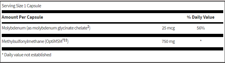 MSM은 우리 몸에 필요한 것인데 현대인은 Sulfur가 많이 부족하다. MSM은 결합조직, 인대조직의 대사와 항체를 생산한다. Molybdenum이 추가되어 유황의 신진대사를 높인 제품이다.
