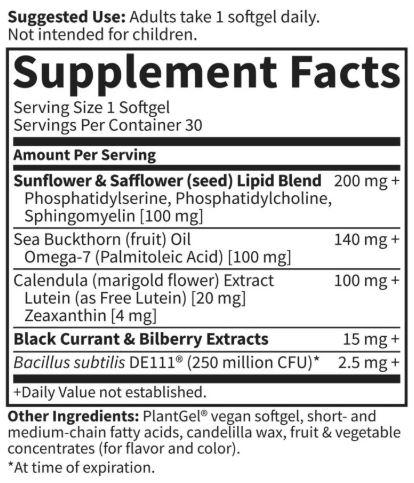 - 해바라기 및 홍화 블렌드 (200mg): 눈 조직에 중요한 지원을 하고 루테인과 제아잔틴의 흡수를 촉진합니다.