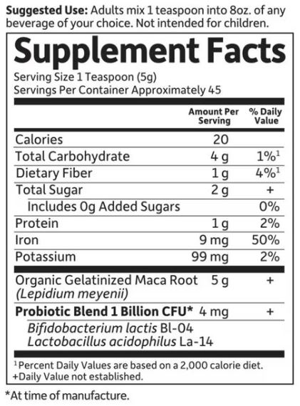 1 찻술 (5 g)을 쥬스나 물 큰 컵 (8 oz.)에 타서 복용. 생리를 하는 여성의 하루 권장량은 18 mg이고 성인 남성의 하루 권장량은 8 mg입니다.