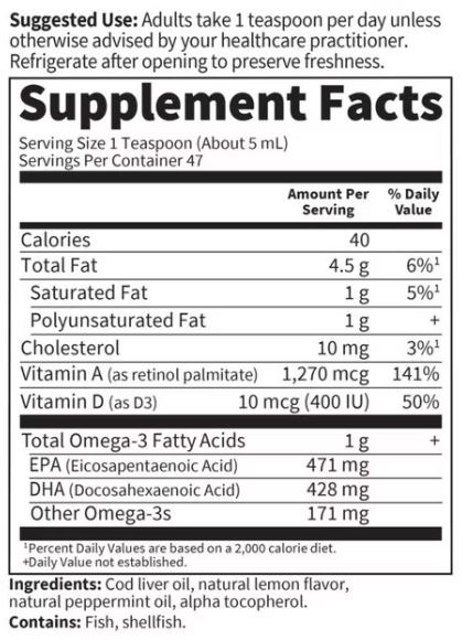 레몬 민트 맛의 오일 한 티스푼에는 오메가-3 지방산 1.4g, 비타민 A 4,500 IU, 비타민 D 450 IU가 함유되어 있습니다.