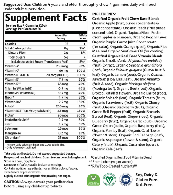 USDA 유기농 인증 및 Non-GMO 과일과 비타민을 결합시킨 4세 이상 종합비타민 구미입니다.