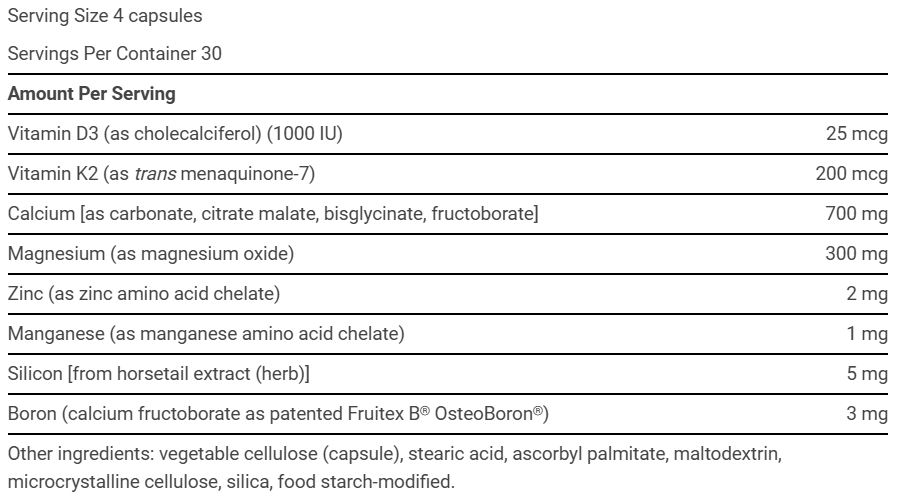 뼈 건강을 위한 칼슘은 비타민 D3가 있어야 효과적입니다. 비타민 K2, 마그네슘, 붕소, 아연, 망간, 실리콘과 같은 다른 영양소도 뼈 건강에 매우 중요합니다.