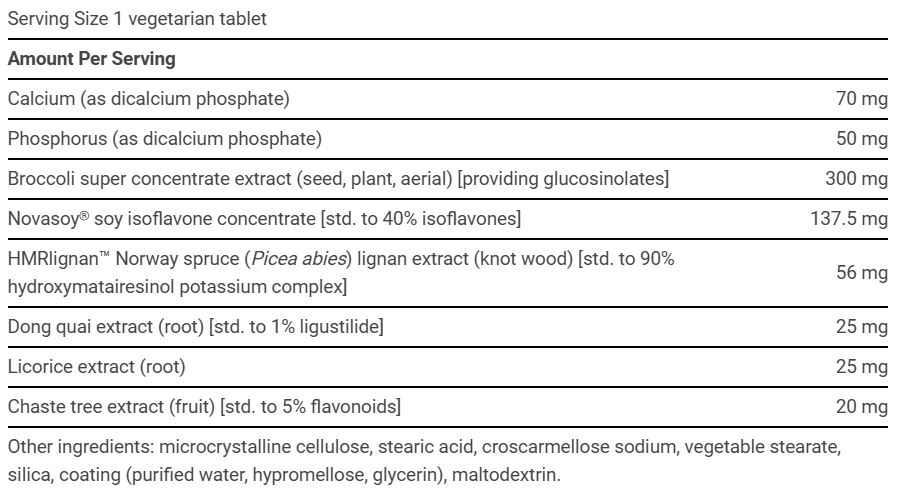이 제품은 한 알만으로 대두 이소플라본(soy isoflavones)과 노르웨이 가문비나무 리그난(Norway spruce lignans), 브로콜리, 감초, 체이스트베리, 당귀 추출물 등 다양한 식물 영양소를 제공합니다.