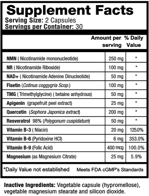 심혈관 건강 제품으로 NMN, Fisetin (피세틴), Apigenin (아피제닌), Quercetin (퀘르세틴), Resveratrol (레스베라트롤), TMG 가 함유되어 있으며, 이 주요 성분의 작용은 다음과 같다.