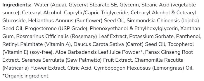 이 크림에는 자연 유래 프로게스테론이 함유되어 있어요. 프로게스테론은 남성과 여성 모두에게 존재하는 호르몬이에요.