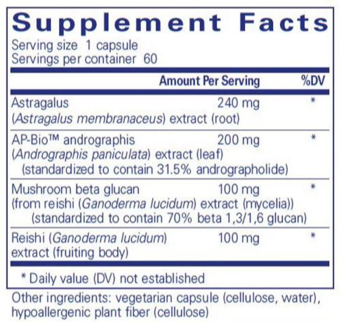 다당체(polysaccharides)가 풍부해서 세포 면역력을 키우는 데 탁월하며 추출물도 들어가고, mushroom beta glucan 100 mg에 70%인 70 mg의 정제된 베타-글루칸 1,3/1,6도 들어있어 면역을 증강시킨다.
