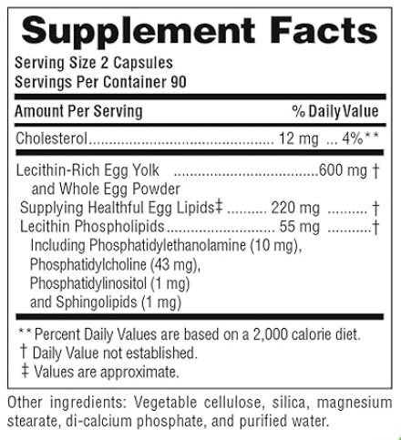 레시틴이 풍부한 계란 노른자 600mg 함유, 이 중 220mg은 계란 지질. 레시틴 인지질 55mg 함유