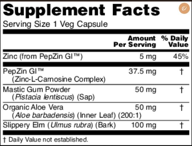 이 제품에는 임상적으로 입증된 PepZin GI가 포함되어 있는데, 이는 카르노신과 결합된 아연의 형태로, 위벽이 스스로 치유하는 자연적인 과정을 촉진하여 위벽의 건강을 지원합니다.