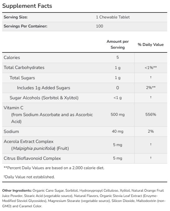 알약을 삼키지 못하거나 어린이들이 복용하기 좋은 오렌지-파인애플 맛의 씹어먹는 비타민 C 이다. 비타민을 수시로 복용하는 경우 먹기 간편하고 맛이 좋아 식후 입가심이나 간식으로도 적당하여 추천한다. 그리고 장거리 운전할 때 운전 스트레스로 비타민 C가 많이 소모되므로 비타민 C를 종종 복용하는 것이 좋은데 먹기 간편하여 추천합니다.
