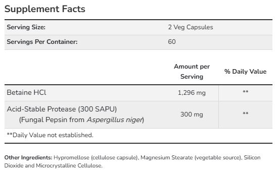 염산(HCl; 위산)은 일반적으로 위에서 생성되며, 펩신 활성화를 통해 단백질 소화를 돕고, 장내 미생물총의 건강한 균형을 유지하며, 장 효소의 방출을 자극합니다.