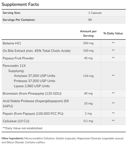 브로멜라인(Bromelain), 지방을 소화하는 소 담즙(Ox Bile), 판크레아틴(Pancreatin), 파파인(Papain)으로 구성된 슈퍼 엔자임은 지방, 탄수화물, 단백질의 분해를 최적화하여 소화를 돕습니다. 소화가 잘 안 되는 사람들은 거의 다 위산 분비가 부족한 저산증이 있습니다. 그러므로 위산인 Betaine HCl과 같이 복용해야 더 소화가 잘 되게 됩니다.