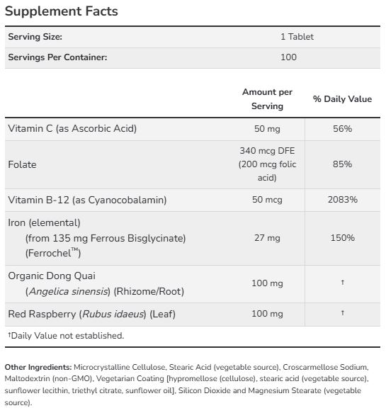 철분은 적혈구 내에서 몸 전체 세포로 산소를 운반하는 분자인 헤모글로빈 형성에 필요한 미네랄입니다. 비타민 B-12와 엽산은 적혈구 생산에 필수적이며, 비타민 C는 위장관에서 철분 흡수를 향상시키는 것으로 알려져 있습니다. 이 채식주의 포뮬러는 잘 흡수되고 변비를 유발하지 않으며, 신체의 철분 흡수 및 활용을 극대화하도록 설계되었습니다.